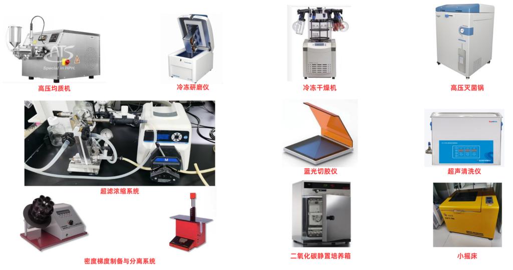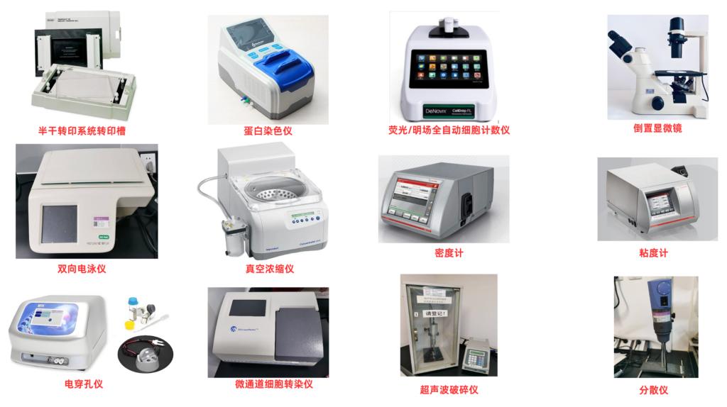 半干转印系统转印槽、蛋白染色仪、双向电泳仪、真空浓缩仪、电穿孔仪、微通道细胞转染仪、荧光/明场全自动细胞计数仪、倒置显微镜、密度计、粘度计、超声波破碎仪、分散仪、高压均质机、冷冻研磨仪、超滤浓缩系统、密度梯度制备与分离系统、冷冻干燥机、高压灭菌锅、蓝光切胶仪、超声清洗仪、二氧化碳静置培养箱、小摇床、微量紫外分光光度计、低温冷冻离心机、PCR仪